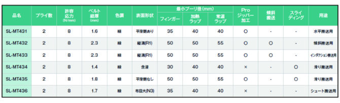 物流現場では、水平ライン、傾斜ライン、急停止・急加速を伴うインダクションライン、横方向から搬送物が合流するライン、搬送物を滑らせるシュートラインなど、用途に応じて搬送用ベルトに求められるニーズは多岐にわたる。これらのニーズに応えるために、それぞれの用途に対応する機能を付加した搬送用ベルト6品種を新たに開発した。
