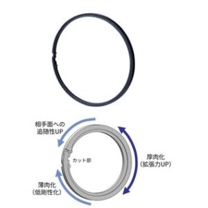 自動車のオートマチックトランスミッション(AT)や無段変速機(CVT)において、油圧を保持するために使用される回転用シールリングの形状設計に関する発明。オイル漏れを低減するために、非対称(三日月)の形状に設計とした。シールリングの接合部周辺は厚みを薄くして剛性を抑え、反対側は厚みを持たせることで拡張力を高めている。同形状により、シールリング外周面に生じる隙間を低減し、ハウジングとの密着性が向上することで、最大80%のオイル漏れを低減する。高い密封性と耐久性を活かし、油圧の安定性を向上させ、異物の噛み込み防止にも効果を発揮する。