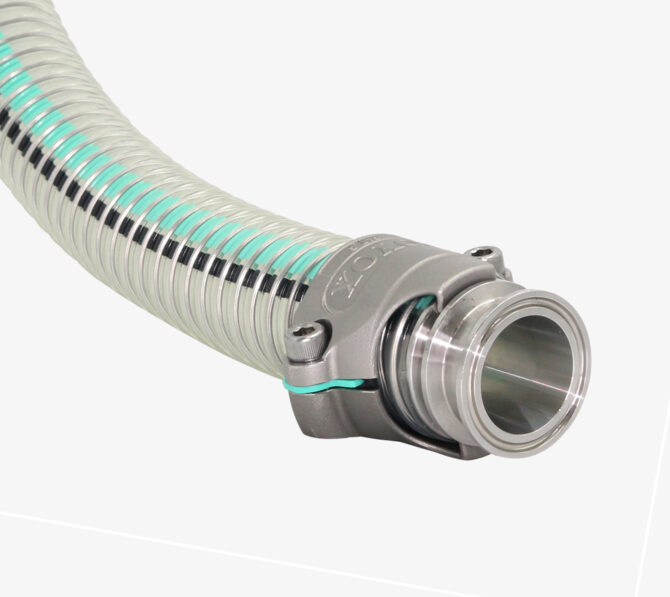 新製品「トヨコネクタ TC6-FE」(対応サイズホース内径38ミリ、50ミリ)は、食品や医薬品などの粉体搬送ラインでの課題解決に特化したホース継手。既存商品「トヨフーズアースホース」の専用継手として開発され、同ホースと組み合わせて使用することで効果を発揮する。