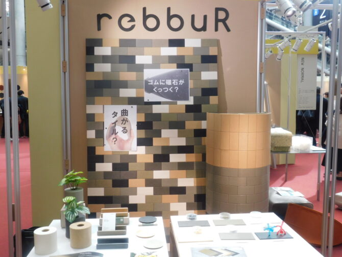江北ゴム製作所は、参加している「家業×デザイナーの協業」をテーマにしたプロジェクトの「NEW NORMAL」が設置した「LIFE×DESIGN」ブースに、「rebbur(リバー)」ブランド製品を展示した。同製品は、天然ゴムに海苔の端材やお茶の端材、卵の殻、檜の木屑など廃棄されていた素材を混ぜ有効活用したサスティナブルな製品で、現在プランター、マルチスタンド、コースターの3種類が展開されている。今回はこれらに加え、廃棄された鉄粉を含んだゴム素材使用によりマグネットシートとしても使える「rebbur SHEET」、rebbur素材を曲面への使用など扱いやすく自由に組み合わせられるようにしたゴムタイル「rebbur TILE」なども展示した。