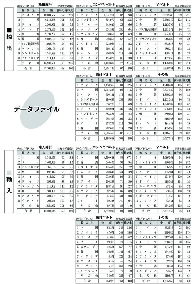 Vベルトは33億8,146万円で同4%減。タイ、インドネシア、中国の上位3カ国が減少した。歯付ベルトは2億5,392万円で同63%増。1位の中国、2位のアメリカなどが大幅に増加した。その他は17億2,585万円で同2%減。1位のスイスが大幅に減少した。