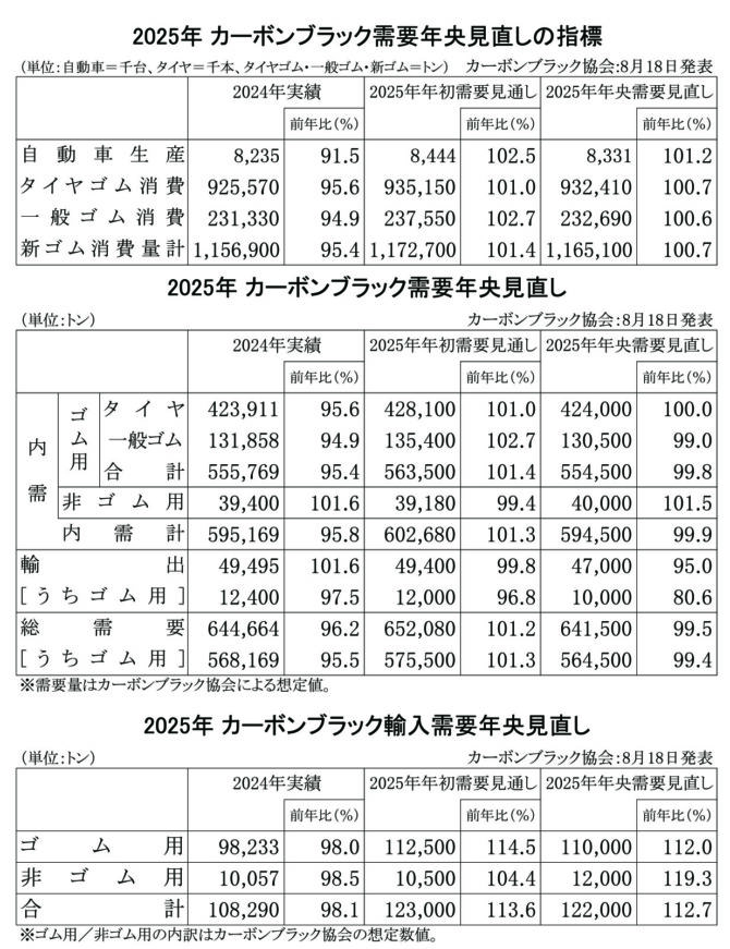 カーボンブラック協会は8月18日、「2025年 カーボンブラック需要年央見直し」を発表した。
