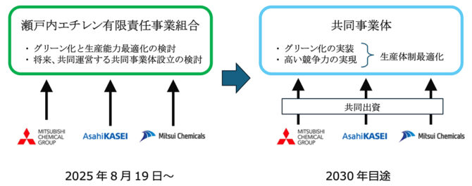 旭化成、三井化学、三菱ケミカルは、西日本に各社が保有する全2基のエチレン製造設備について、2030年を目途にグリーン化および生産能力最適化を実現するため、3社で有限責任事業組合(LLP)を設立した。出資比率は1対1対1。