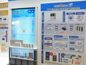 既存設備の改善によるCO2排出削減では、関西電力グループの関電エネルギーソリューションが、空調の快適性を損なわずに電力消費を1~2割削減できる独自手法「おまかSave-Air」を展示。パナソニック環境エンジニアリングは2026年中に試験販売を計画する「ガラス型ペロブスカイト太陽電池」を公開した。