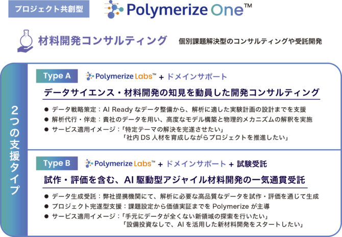 はい。「Polymerize Labs」のツール提供だけでなく、特定のテーマについて私たちが材料コンサルティングから試作・試験までを一気通貫で受託するサービスです。メーカー様とお話しすると、「サプライヤーから既存のポリマーを買ってきて配合を工夫してきたが、もう組み合わせのパターンが出尽くし、性能向上が頭打ちになっている」というお悩みをよく耳にします。