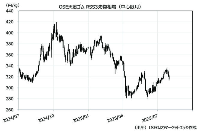 供給サイドでは、東南アジアや中国南部で豪雨が続いているが、ゴム供給に大きな混乱をもたらすような大規模な洪水被害などは報告されておらず、供給リスクの織り込みは本格化していない。OSEゴム相場も当限に対するプレミアム加算は見送っている。