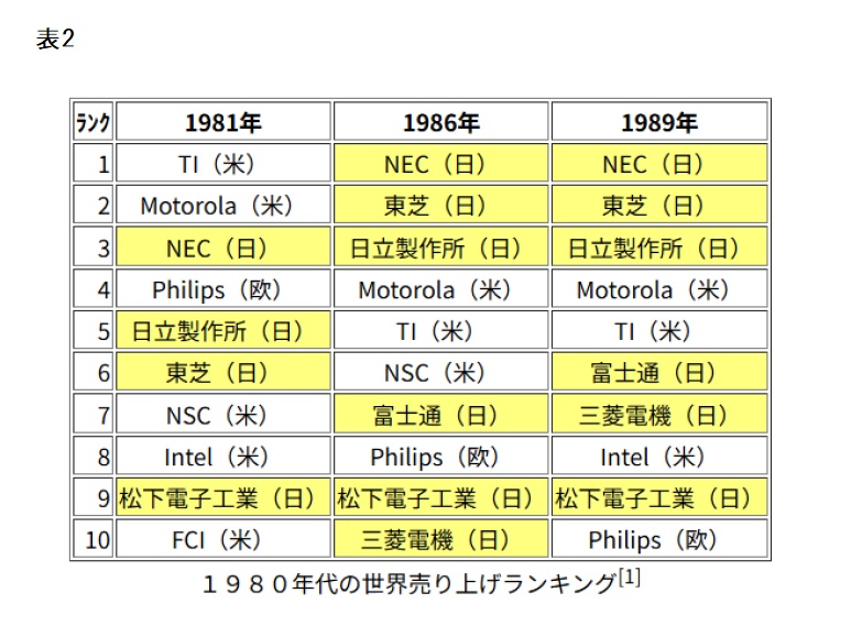 こうして品質の重視、積極的な投資による価格競争力の向上と、安定した供給力を確立した日本の半導体メーカーの戦略は、日本の半導体のステータスを大幅に向上させ、DRAMで米国メーカーを上回る確固たる地位を築きました。DRAMにおいて日米メーカーのシェア逆転が明確になり、米国「Intel」「Motorola」「AMD」「NSC」「MOSTEC」等従来のDRAMの覇者であった米系メーカーの撤退など、日系メーカーの台頭が顕在化して米国半導体業界の危機感が高まり、一連の日米半導体摩擦問題につながって行きます。