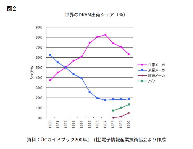 さらに64KDRAMについては、コンピュータメインフレームに加え、IBMのPC向け需要が大きく寄与し、需要は大きく拡大して行きます。米国のコンピュータ産業でのDRAM採用本格化に伴うDRAM需要の急速な拡大の中で、品質面でも高い評価を得た日本製DRAMは、米国コンピュータメーカーに相次いで採用されます。設計・プロセス技術でも先端に立った日本製DRAMは品質・納期・価格でも高評価を確立し、1981年には64KDRAMで世界No1シェアとなり、1987年に256KDRAMを中心に日系メーカーの世界シェアは80%を越えました。(図2)