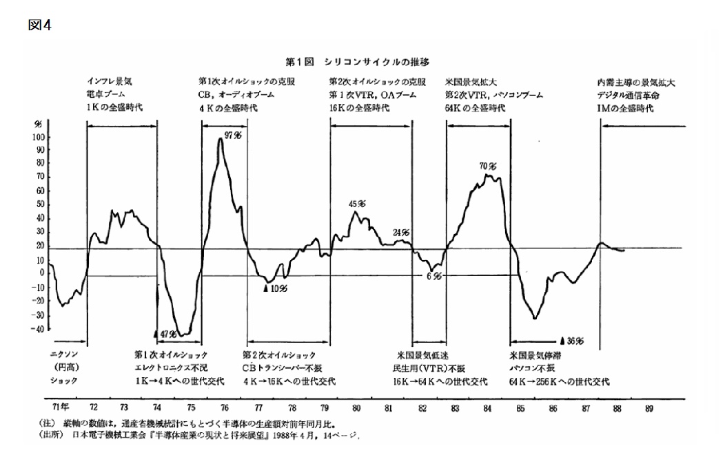 この頃の半導体需要はシリコンサイクルと呼ばれる約4年周期で好不況を繰り返す周期がありました。(図4)筆者が半導体産業に従事し始めた1984年は、好況のまっただ中で、日本半導体企業はどれだけ全力で生産しても需要を満足させることが出来ず、当時全盛期であった汎用半導体64KDRAM製品等では生産した製品をどこに納入するのか、マイコン等の専用半導体では生産ラインをどこ割り振るのかと言った、アロケーション(割り当て)と呼ばれる完全な売り手市場でした。その時期は前述の通り、販売高も急速に拡大したこともあり、設備投資に対しても非常に積極的で、日本企業Top3各社は1,000億円を越えるもの(対生産額約30%)でしたが、その後のシリコンサイクルの後退期では、各社1/3から半分になってしまいました。