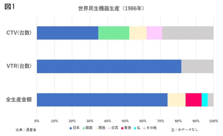 そんな全盛期に至るまでに、日本の半導体企業は1970年代の成長期に、電卓・時計用IC、民生用アナログIC、シリコントランジスタ等を軸足に、16K/64KDRAM、ワンチップマイコン等の開発を進めました。1970年~80年代はテレビやオーディオに代表される民生機器において、日系電機メーカーはその開発力、技術力や生産能力でトップランナーであったことから、世界的な競争力は非常に高く、民生機器市場で世界をリードする地位となっていました。(図1)民生機器ではテレビ、VTR等が好調であった事に加え、新たにCD等の新しいメディア機器が出現しました。この中で大きな需要分野であるカラーテレビは、日本国内での普及率は既に上限にありましたが、輸出を中心に日本の国内生産規模は拡大し、1985年に1700万台と過去最高となりました。VTRは1970年代にはβ方式とVHS方式の2方式がありましたが、1980年代前半にはVHSが優勢となり、松下電器が1982年に15万円を切った普及モデルの発売、1985年には10万円モデルの登場で本格的な普及が始まり、生産は1980年が500万台でしたが、1年後には3100万台に急激な拡大をしました。1982年にはCDプレーヤーが発売され、1984年にはソニーにより5万円を切るポータブルCDプレーヤーが市場に投入された事により普及に拍車が掛りました。加えて、1979年に登場したウォークマンも世界的なブームとなり、新たなオーディオ機器やメディアが本格的な普及期を迎えました。更に、1981年には任天堂がファミコンを発売し、家庭用テレビゲームという新たな市場が立ち上がり、ROMをはじめとする新たな半導体の需要をもたらしました。