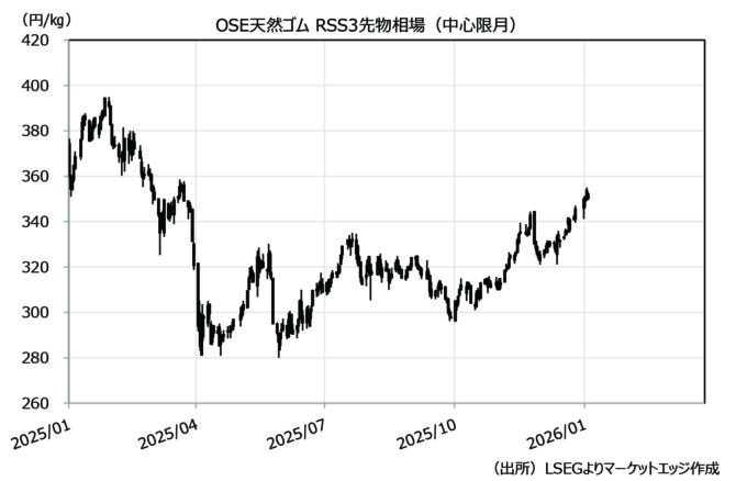 OSE天然ゴム先物相場(中心限月)は1キロ=350円水準まで値上がりし、2025年3月以来の高値を更新する展開になった。年末年始を挟んで上海ゴム先物相場が約3カ月にわたるボックスを上抜けしたことが好感され、OSEゴム相場も上値追いとなった。