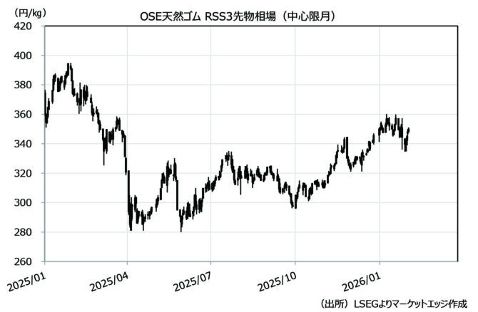 上海ゴム相場の値動きが鈍化する中、OSEゴム相場はドル/円相場との連動性も強めている。2月8日に衆議院選挙を控えているが、各種世論調査では自民党の優勢が報じられた。このため、高市政権の「積極財政」が続くとの見方が、株高・円安を促した。ドル/円相場は1ドル=152.08円をボトムに、157円台前半まで切り返した。為替要因だけでも、円建てゴム相場の値上がりが支持される環境になった。実際の選挙結果を受けて、為替相場の反応も注目される。