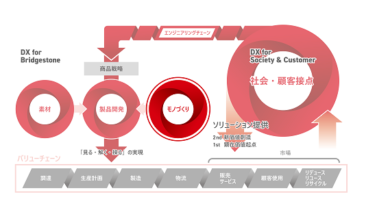ブリヂストンでは、市場・顧客情報を素早くエンジニアリングチェーンに繋ぐ市場・顧客接点のDXとともに、技術イノベーションを推進すべく素材開発から製品開発、モノづくりというエンジニアリングチェーン全体でのDXに取り組んでいる。現場の匠達により長年培われてきた膨大なデータや経験が支える「ゴムを極める(ゴムを見る・解く・操る)」技術などの「強いリアル」に、デジタルを融合する事で、”より大きなデータで、より早く、より容易に、より正確に”、「断トツ商品」開発、「断トツソリューション」に繋げることを目指している。