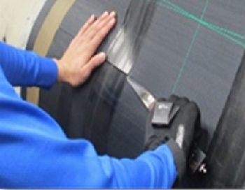 ナイフを使ったタイヤ部材のカット作業