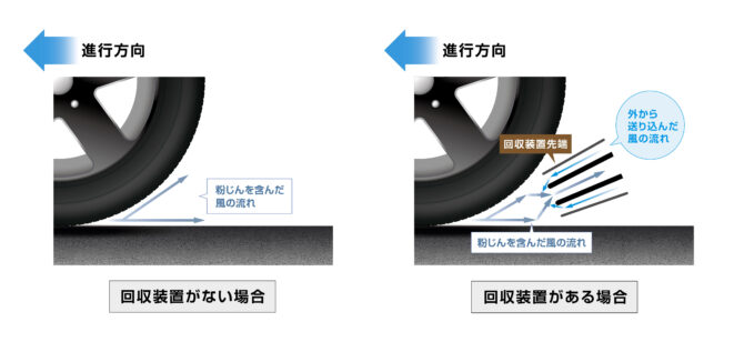 回収装置の有無で変化するタイヤ周辺の風の流れ(イメージ図)
