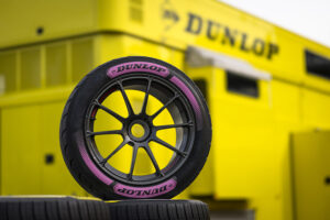 タイヤ事業では、モータースポーツ活動において10月に開催されるさまざまなレースや競技で取り組みの実施を予定している。会場内ののぼりや、スタッフが身に着けるバッジやリストバンドなどのDUNLOPロゴマークを黄色からピンク色へ変更。会場のDUNLOPブースではセルフチェックや定期検診の受診を促すパネルを展示する。