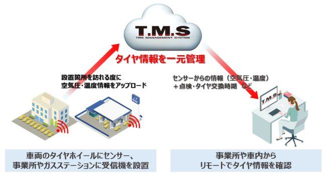 同サービスはホイールに装着したバルブ式のセンサーがタイヤの空気圧や温度を検知し、データをガスステーションや沖東交通の各事業所に設置した受信機経由でクラウド上の「T.M.S」へ自動的に送信。これにより、事業所ではリモートで、ドライバーはオプションの車載表示機や専用スマートフォンアプリでタイヤの状態をリアルタイムに確認できるため、始業前点検の省力化や運行時のタイヤトラブルの早期発見に繋がる。
