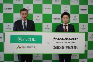 住友ゴム工業と富山県朝日町は、朝日町と博報堂が運営する共助型地域公共交通「ノッカルあさひまち」の車両に、ダンロップの次世代オールシーズンタイヤ「SYNCHRO WEATHER」を装着し、地域住民の交流・活性化に向けての共創プロジェクトを開始する。