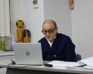 東部ゴム商組事務所からオンラインで講演する馬場ポスティ社長