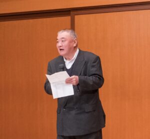 20日の寄席の途中、高畠光敏副理事長(丸高興業社長)があいさつに立ち、共済会の活動内容を紹介した。春のビジネスマナー研修会や、最近開催の「女性のためのセミナー」、本落語会など、福利厚生を目的とした行事が好評を得ていることを説明したうえで、共済会のメイン事業であるグループ保険について詳しく説明した。