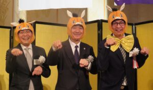 小島理事長を中央に馬の被り物で情熱と協調性をアピールする加藤副理事長(西部ゴム社長、右)と小賀野副理事長(オガノ社長)