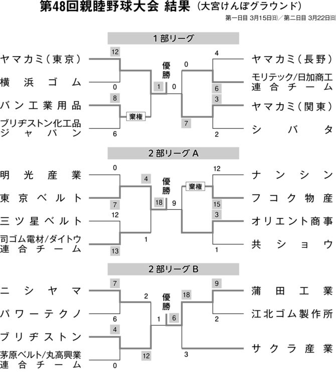 東部工業用ゴム製品卸商業組合(前田淳理事長=東京ベルト社長)の「第48回親睦野球大会」の決勝、準決勝が3月22日、大宮けんぽグランウンド(埼玉県さいたま市)で開催された。